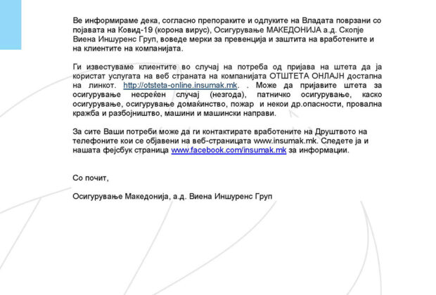 Ве информираме дека, согласно препораките и одлуките на Владата поврзани со појавата на Ковид-19 (корона вирус), Осигурување МАКЕДОНИЈА а.д. Скопјe Виена Иншуренс Груп, воведе мерки