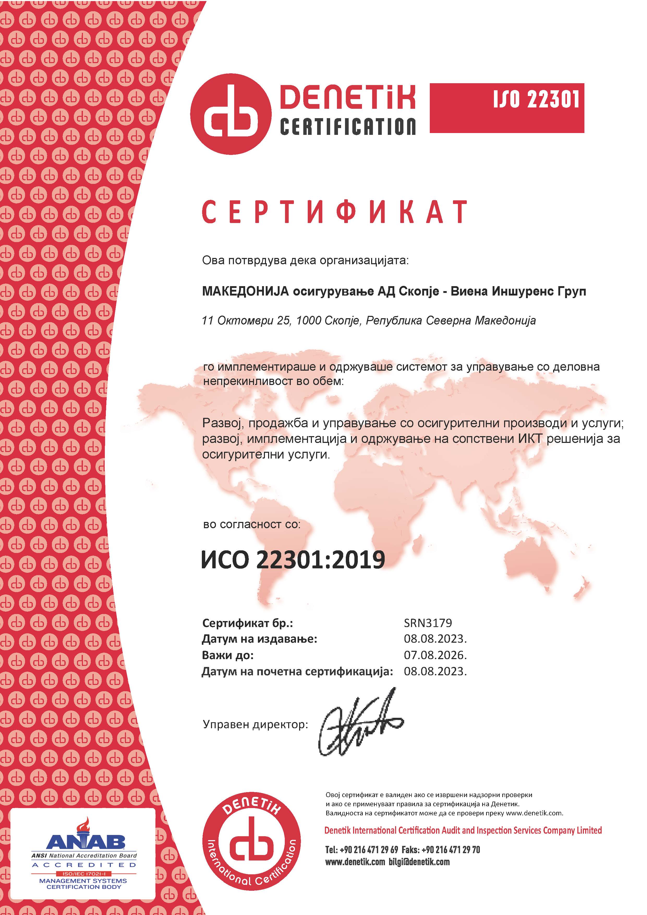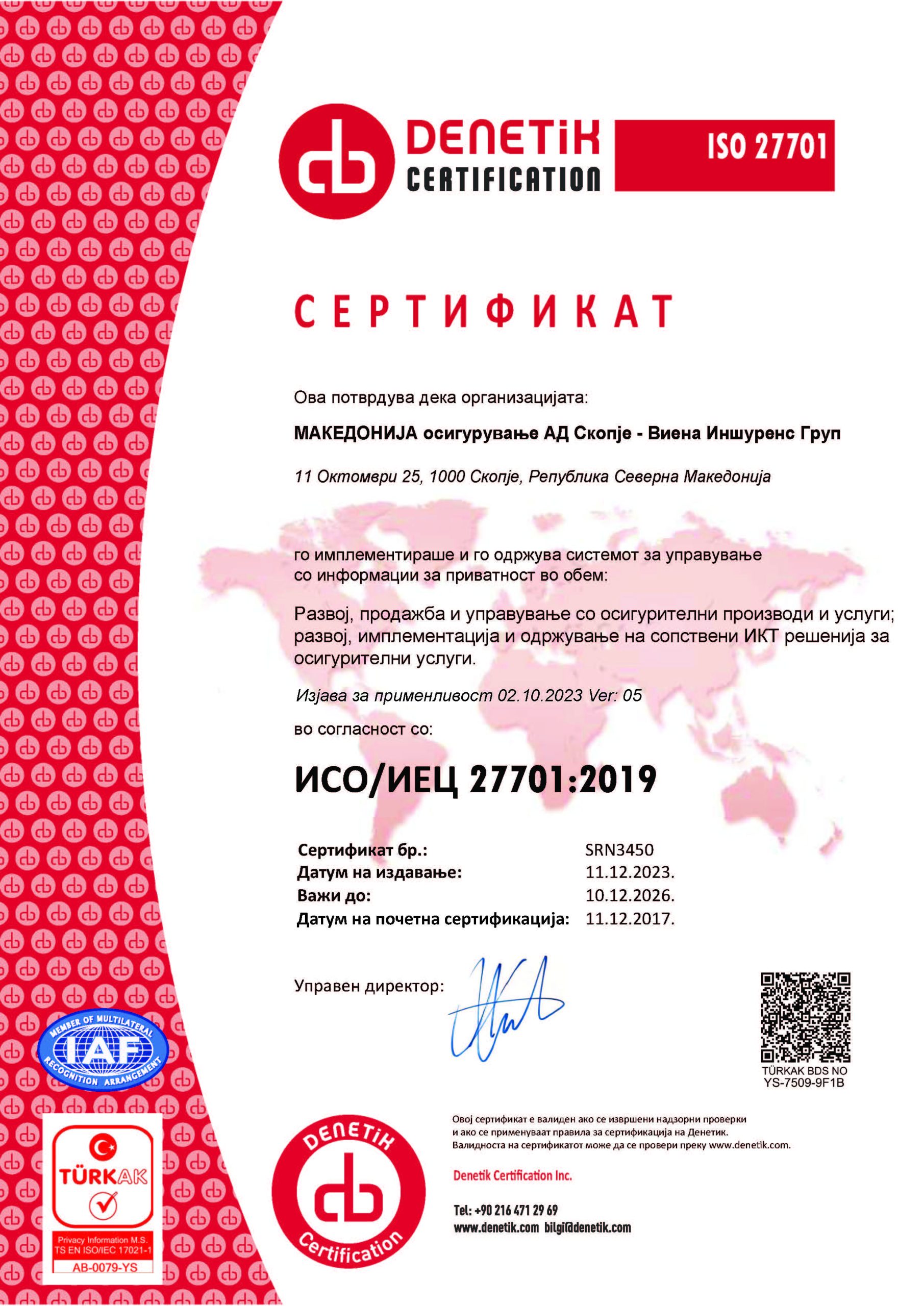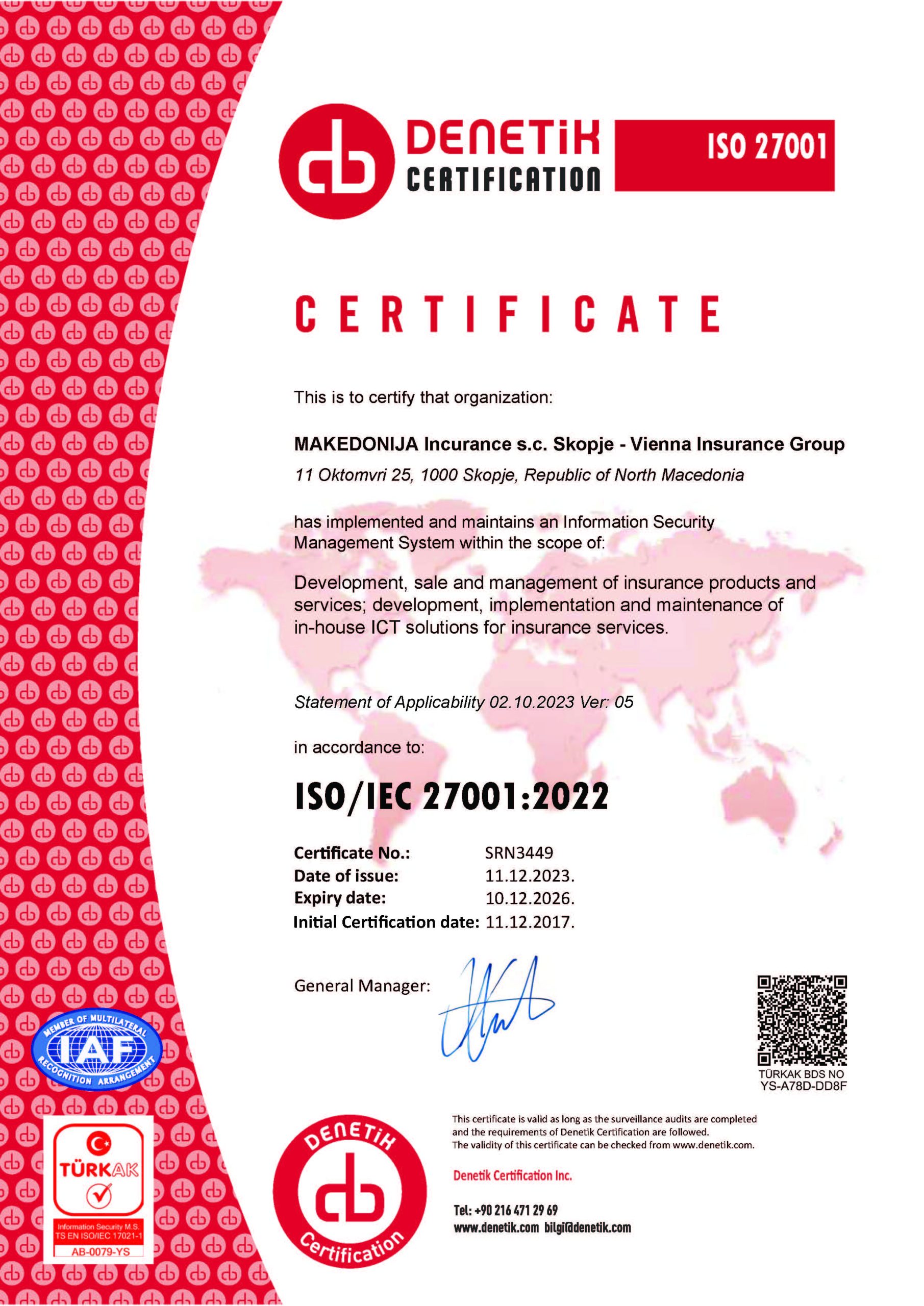 Развој, продажба и управување со осигурителни производи и услуги; развој, имплементација и одржување на сопствени ИКТ решенија за осигурителни услуги. види го сертификатот