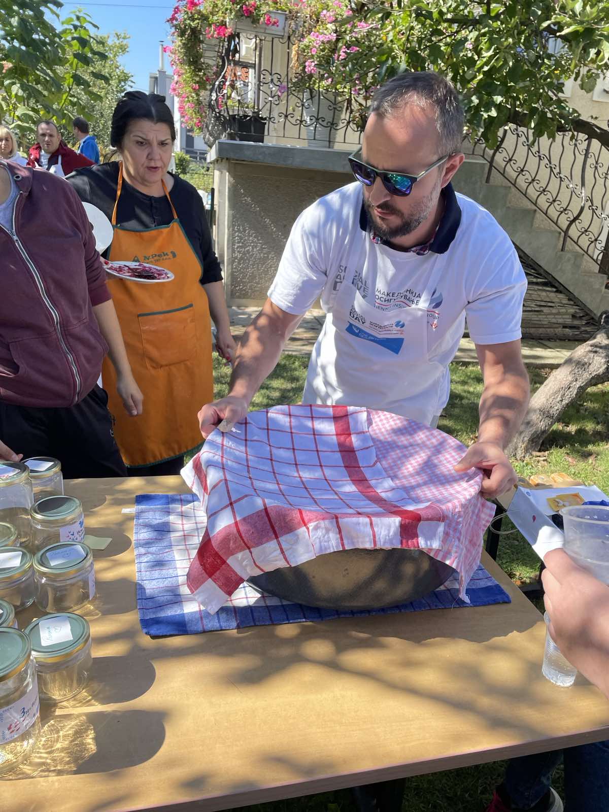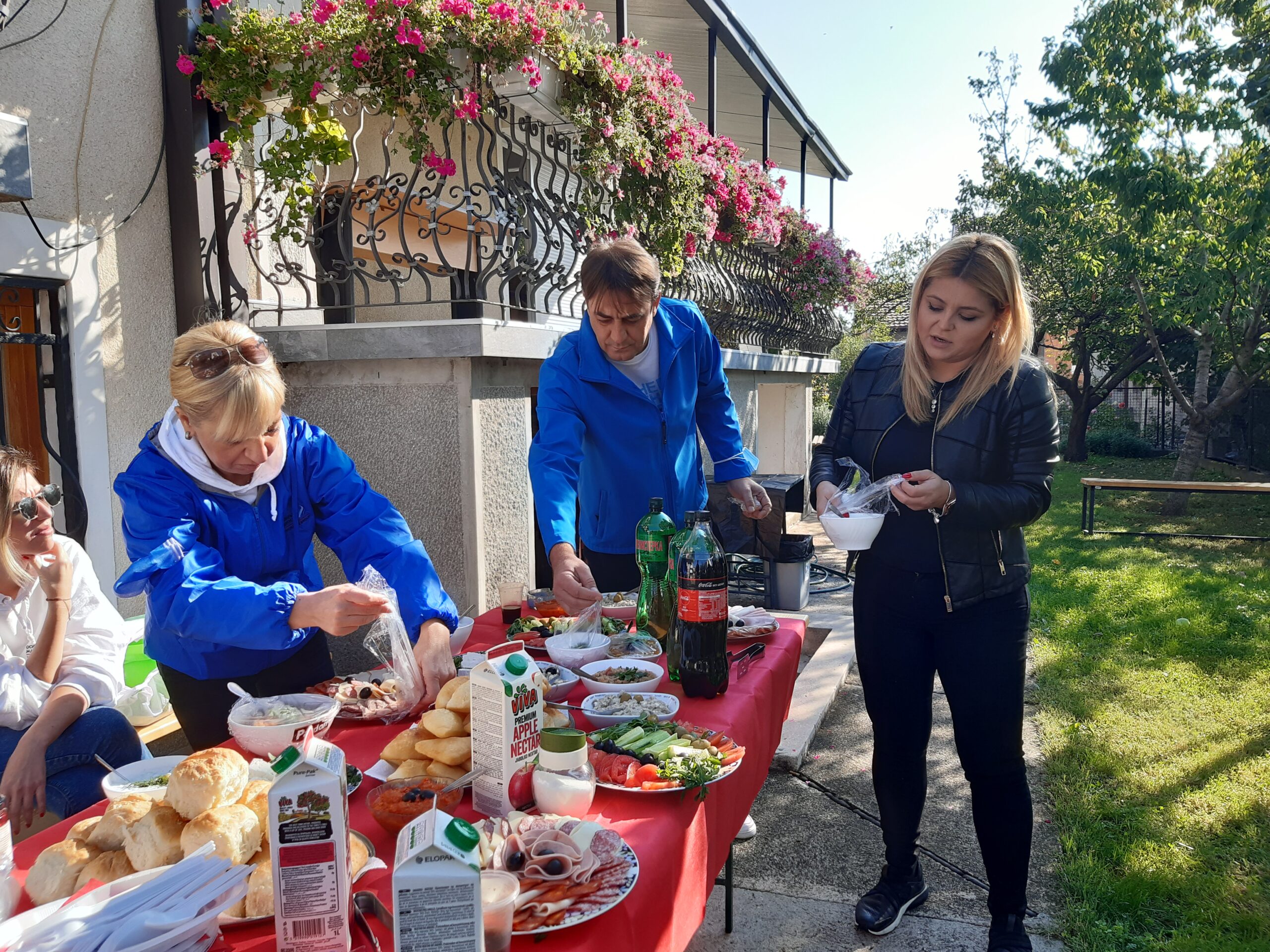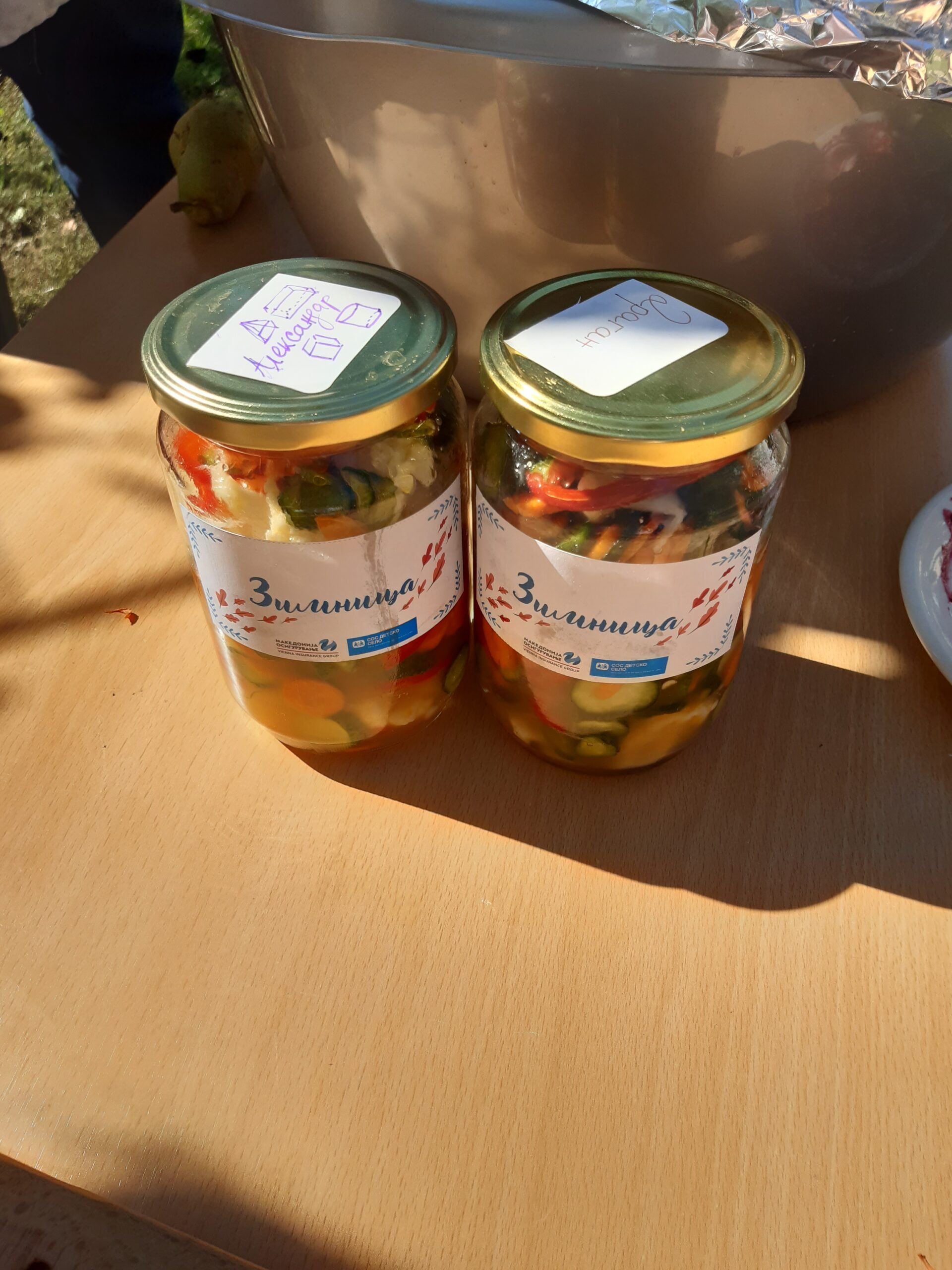 Денот го започнаа со мала закуска со вкусни подготвени лепчиња и пишии, како утрински буст за да подготват уште подобра зимница. Дворот сеуште раззеленет и украсен со шарени сардели само им го зголеми расположението за здружена работа.