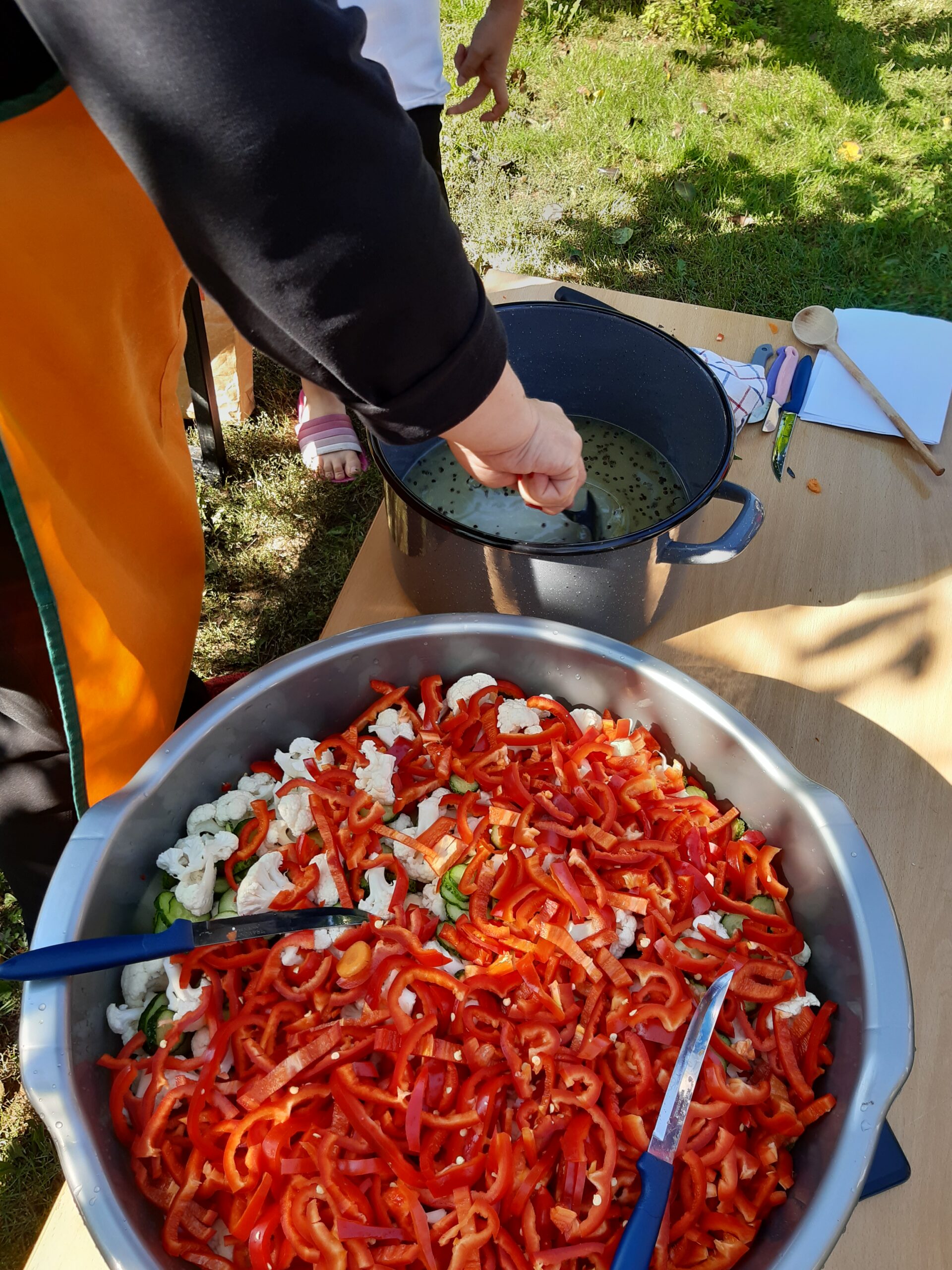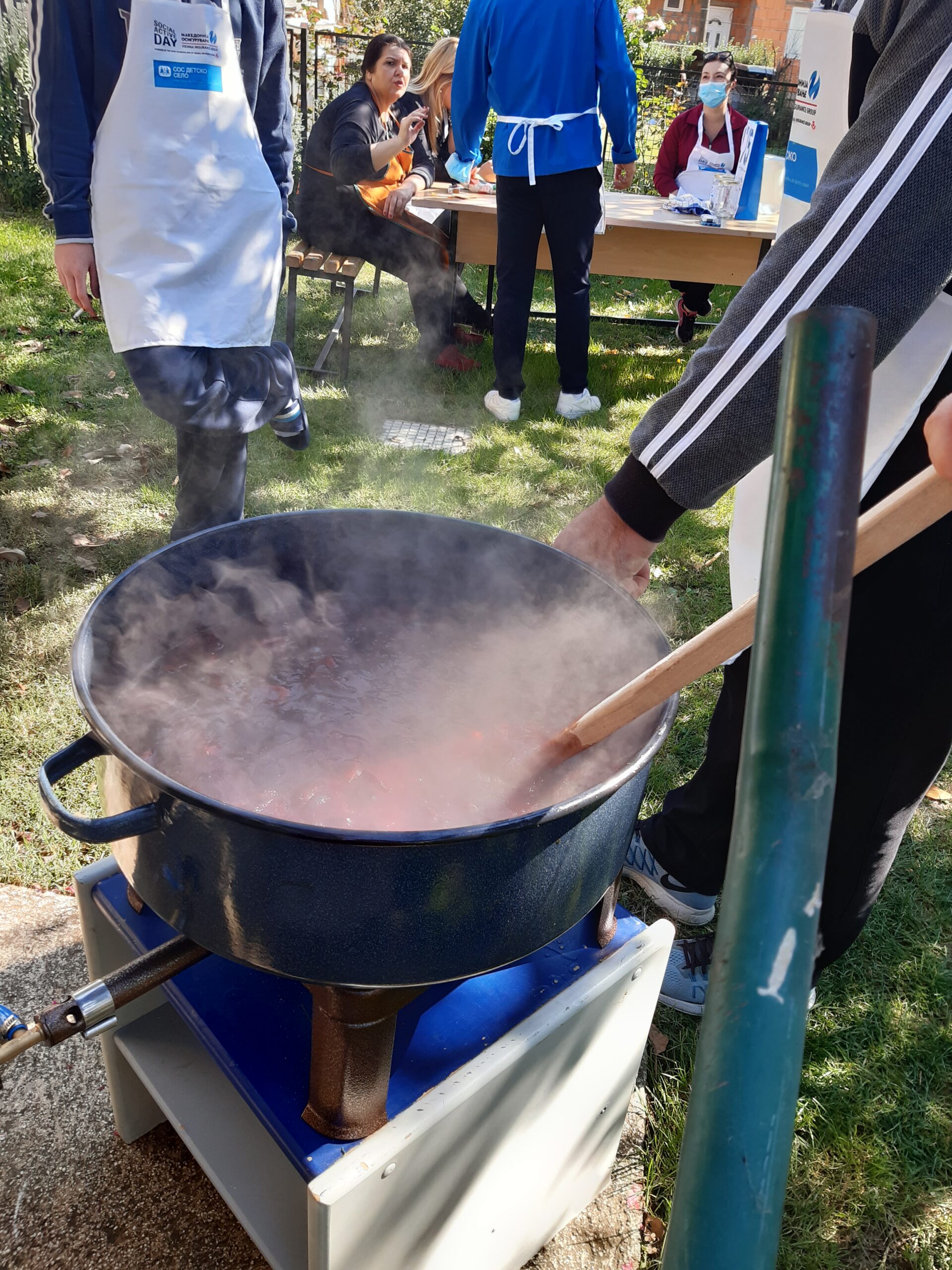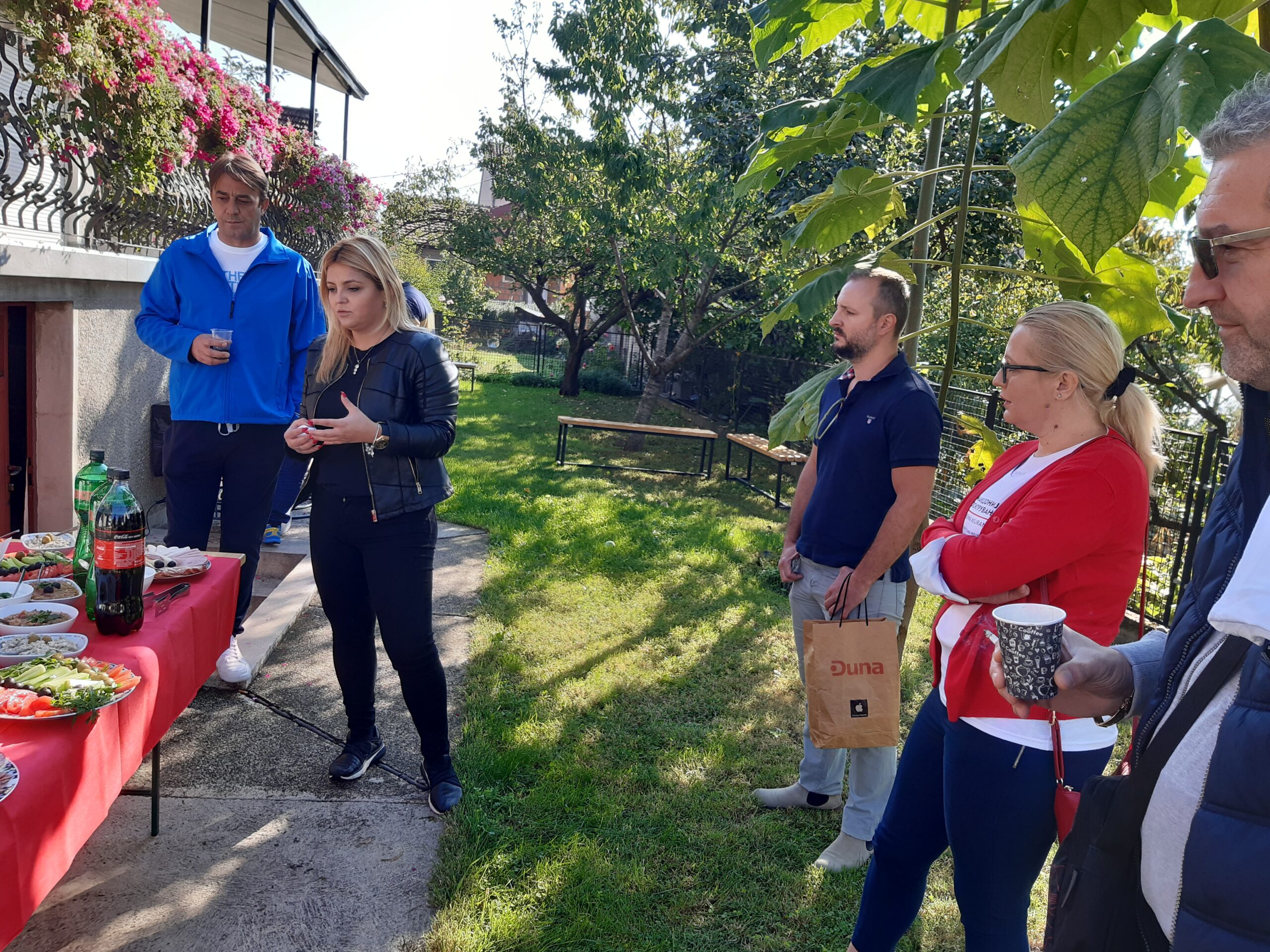 Денот го започнаа со мала закуска со вкусни подготвени лепчиња и пишии, како утрински буст за да подготват уште подобра зимница. Дворот сеуште раззеленет и украсен со шарени сардели само им го зголеми расположението за здружена работа.